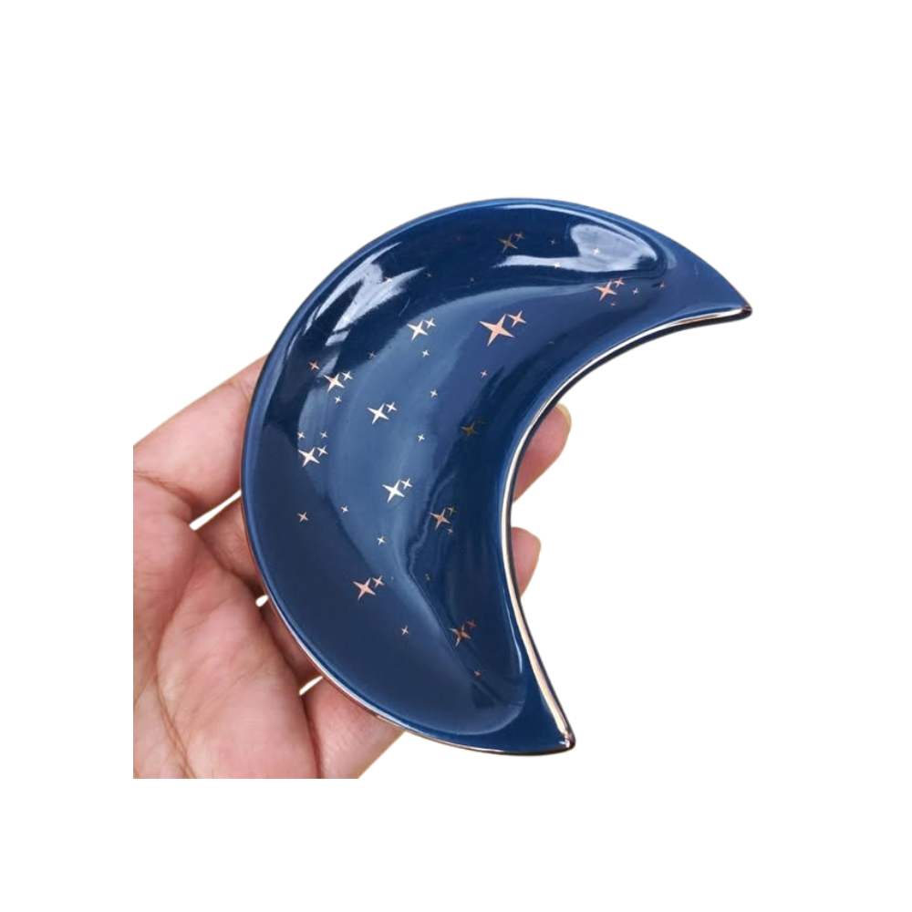 Un delicado platito en forma de luna, decorado con detalles de estrellitas doradas que evocan el cielo nocturno. Perfecto para colocar tus cristales, joyas o pequeños tesoros, aportando un toque mágico a tu espacio. Su diseño celestial y acabado brillante lo convierten en un accesorio único, ideal para quienes aman lo esotérico y lo elegante.